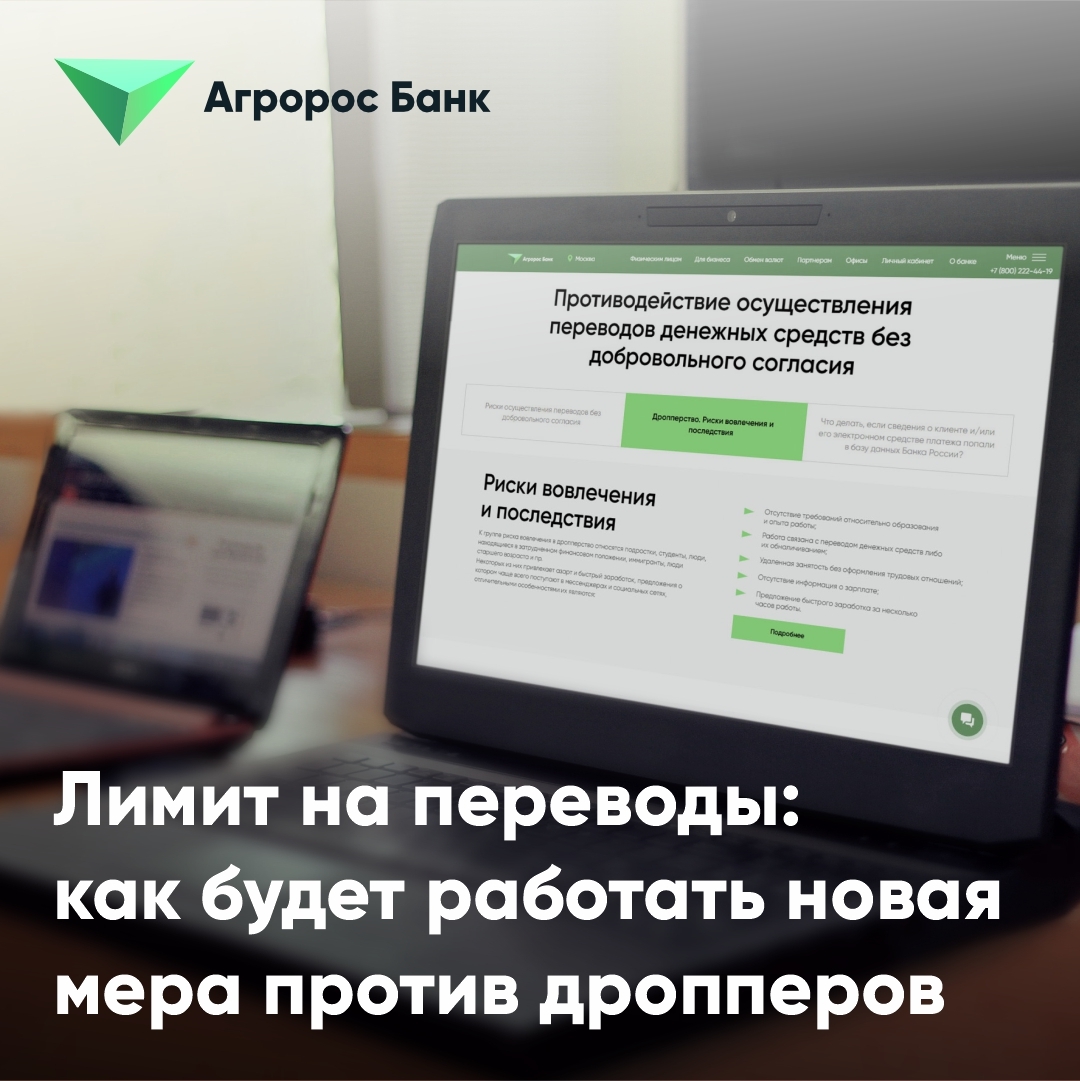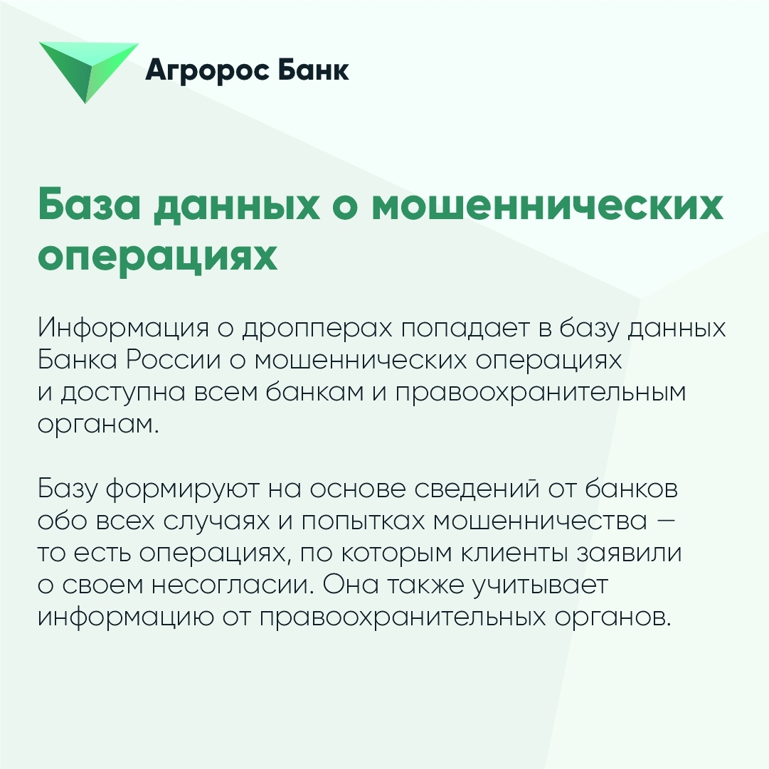 Роль дропперов в мошеннической схеме уголовно наказуема, дополнительно кредитные организации могут ограничивать дропперам доступ к счетам и картам, в том числе с использование дистанционного банковского обслуживания. Также с лиц, незаконно завладевших денежными средствами, в судебном порядке может быть взыскана вся сумма похищенных у потерпевших денег.