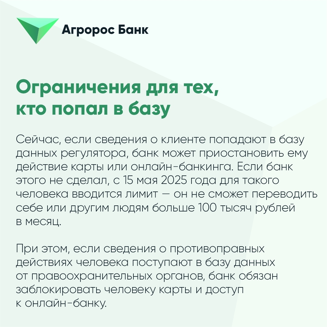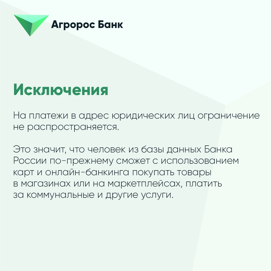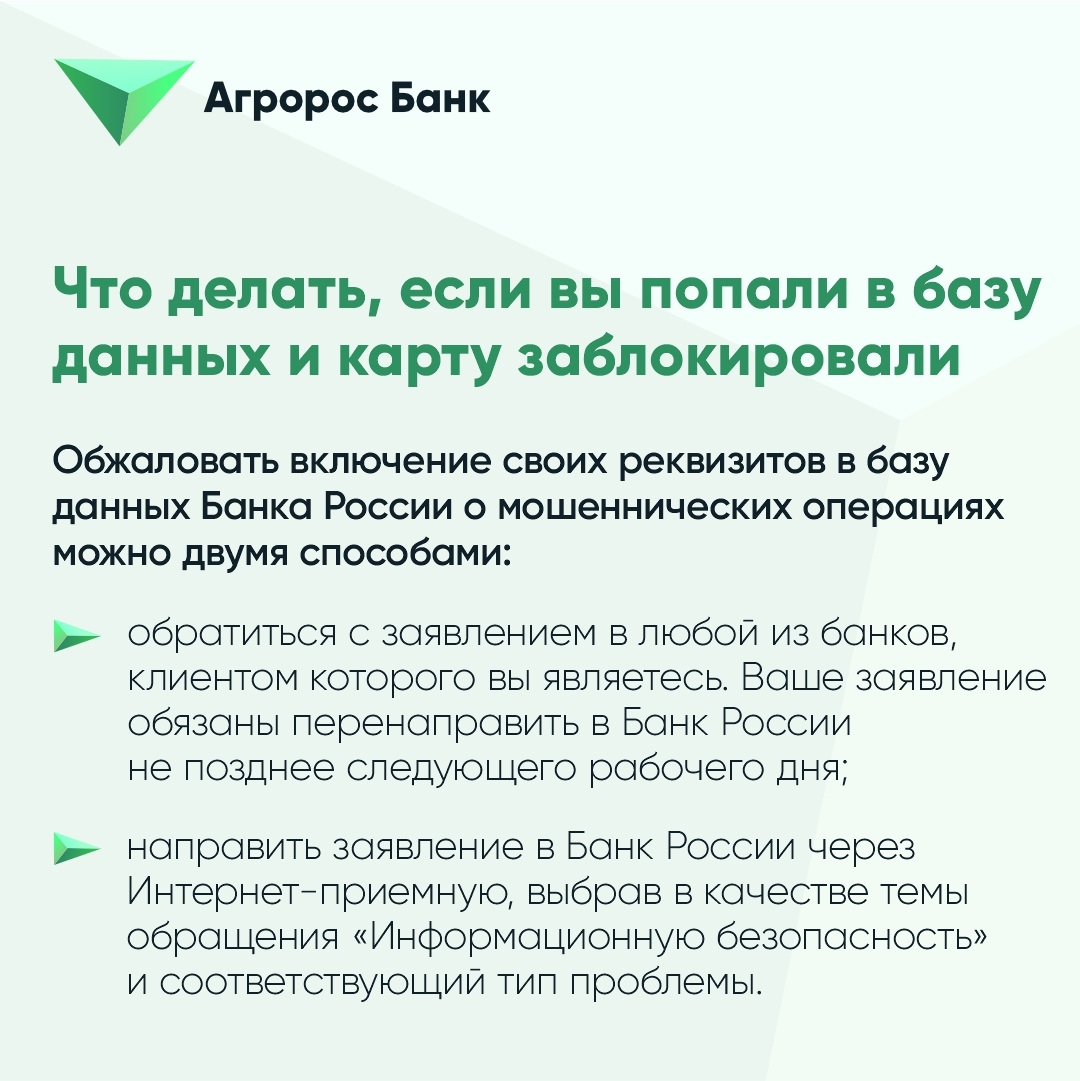 В случае нахождения электронного средства платежа в базе, а также сведений федерального органа исполнительной власти в сфере внутренних дел о совершённых противоправных действиях банк обязан выполнить приостановку использования клиентом электронного средства платежа. После приостановления использования клиентом электронного средства платежа клиент вправе подать заявление в Банк России, в том числе через обслуживающий банк об исключении сведений либо вообще его данных из базы, т.е. о разблокировке. В случае наличия у банка оснований полагать, что включение сведений, относящихся к клиенту и (или) его электронному средству платежа в базу является необоснованным, такой банк вправе самостоятельно (без участия клиента) направить в Банк России мотивированное заявление об исключении сведений. Мотивированное решение об удовлетворении или об отказе в удовлетворении заявления клиента принимается в срок, не превышающий 15 рабочих дней. Решение об отказе в удовлетворении таких заявлений клиент вправе обжаловать в суд в соответствии с законодательством Российской Федерации.